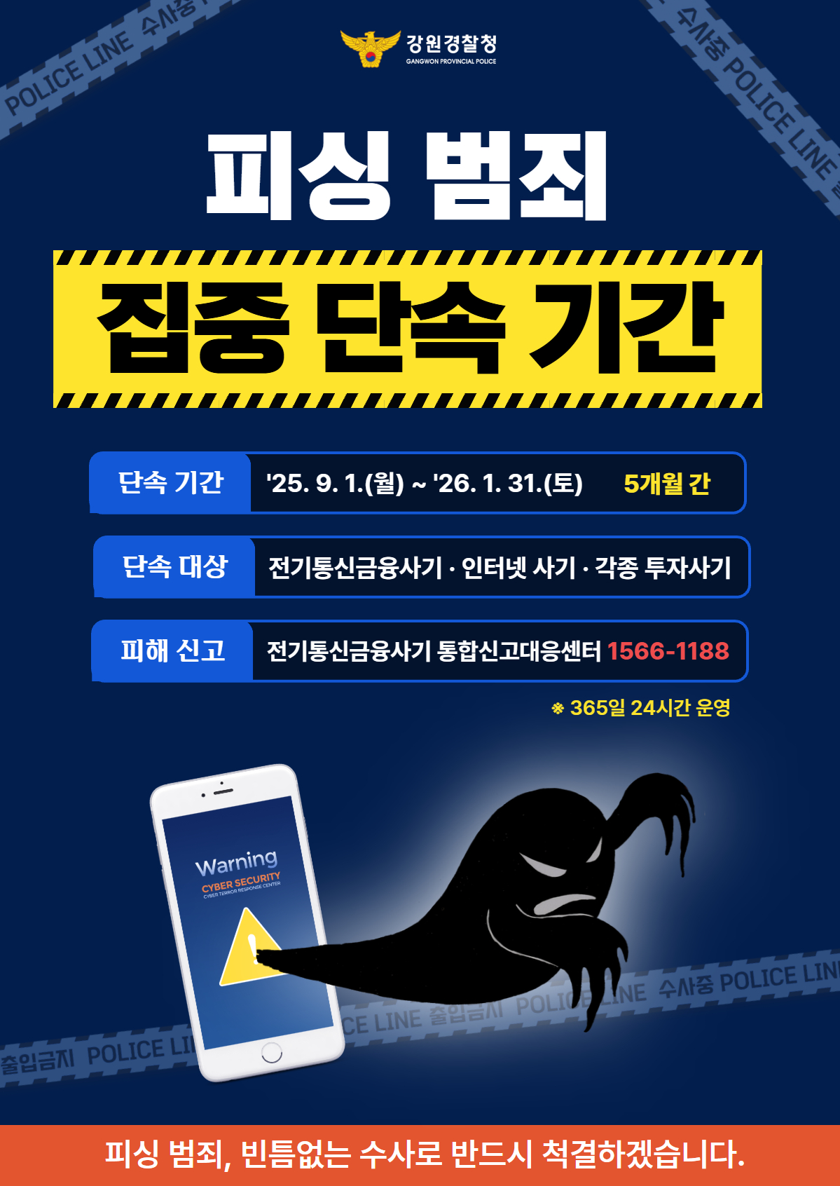 강원경찰청에서는 2025. 9. 1.(월)부터 2026. 1. 31.(토)까지 5개월간 피싱 범죄 집중 단속 기간으로 지정하였습니다.