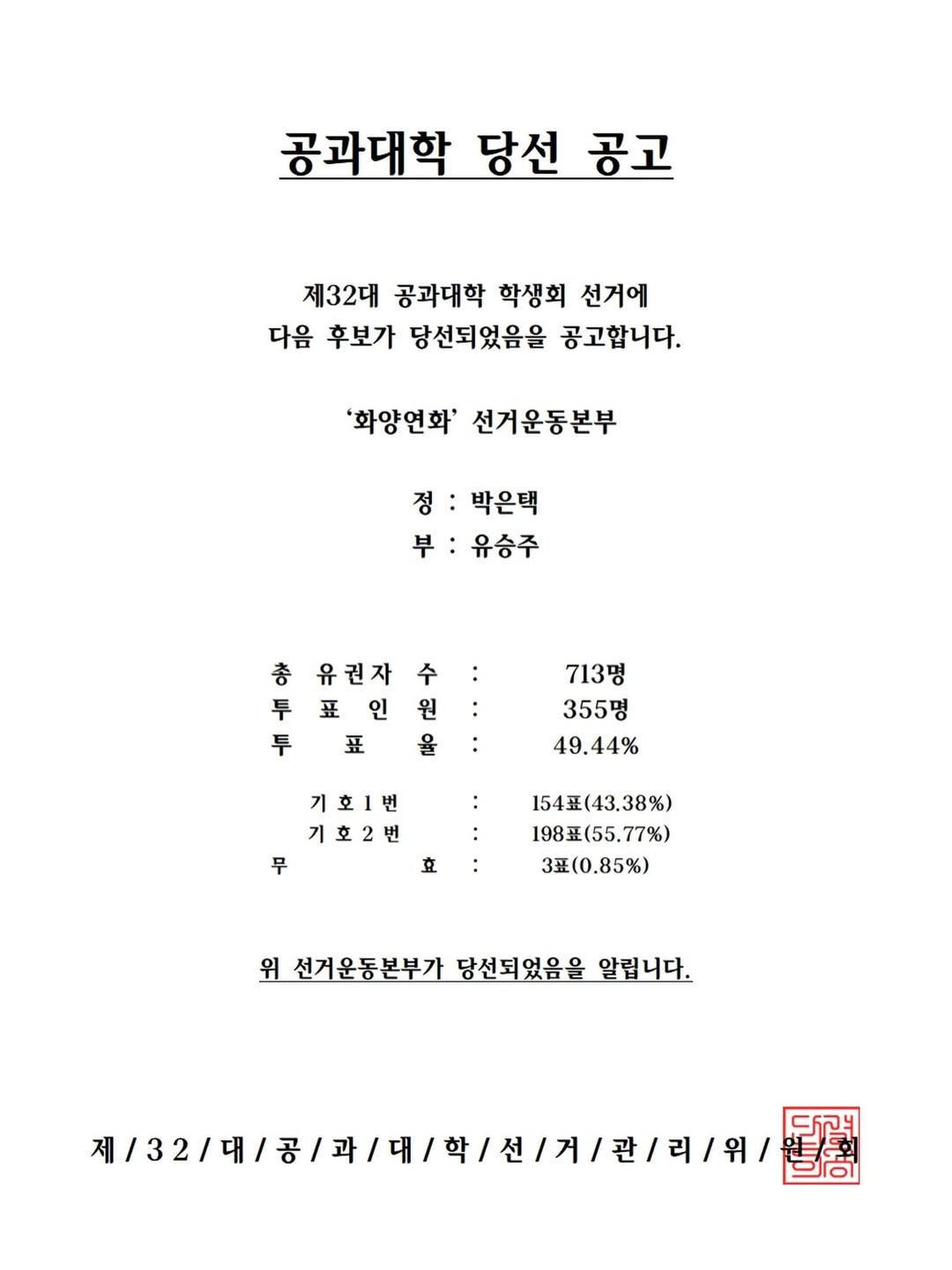 소방공학과 유승주 학생은 제32대 공과대학 학생회 부학생회장으로 당선되었습니다.